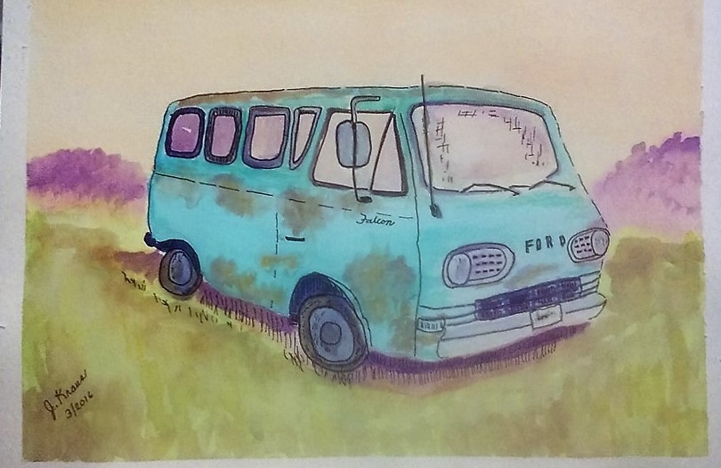 My husband knows nothing about art, but as he so often tells me, he knows what he likes. He definitely liked my watercolor and ink drawing of his van — although he told me maybe I should do it again and leave off all the rust. The rust is the best part! I loved the rusty spots.