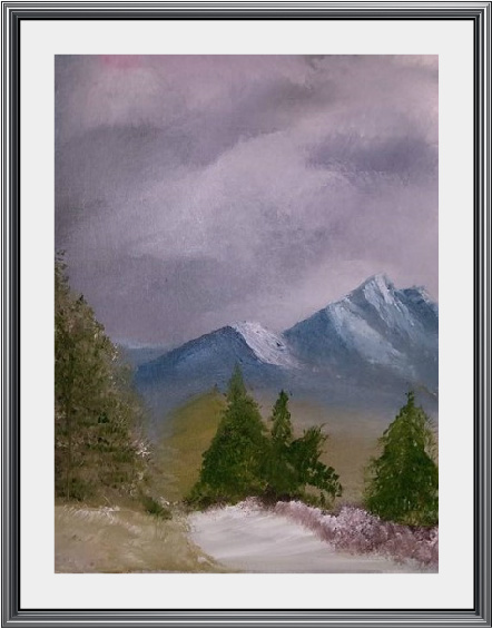 All in all, despite the missteps and imperfections, I was fairly pleased with this “Mountain View”. I plan to keep painting mountain peaks until I feel really comfortable with them. After that, I’ll move on to those pesky trees and try to improve on them. I’ll work on lakes. I’ll do a few river scenes. Gradually I’ll even start adding in buildings and people. Animals, too.