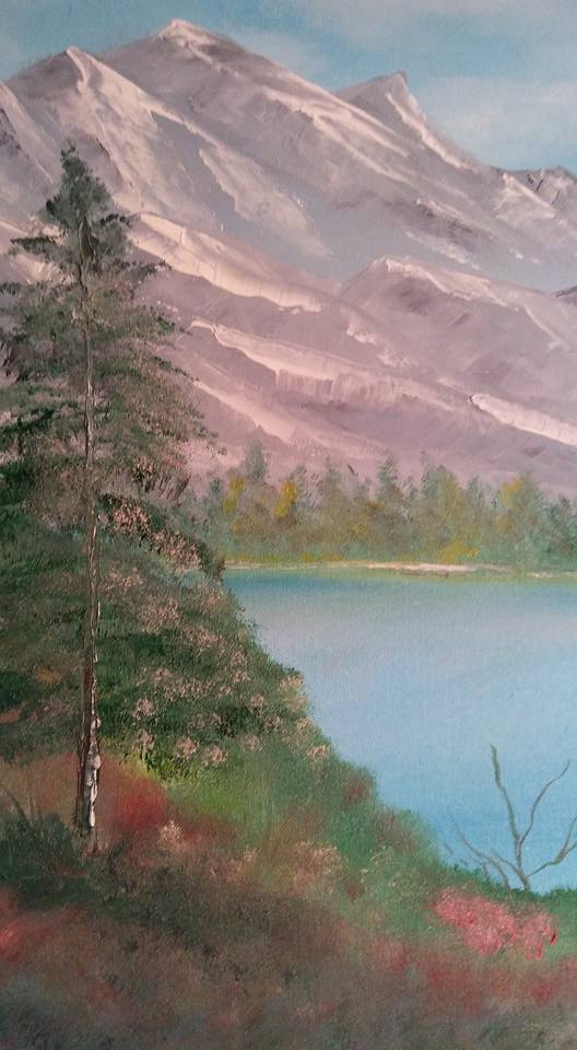 Although I was happy with both the skies and the mountains in this painting, I wasn’t happy at all with the trees. I don’t care much for the color of the distant trees on the shoreline, and I don’t really like the tall pine. You can probably tell I struggled a bit with it. Adding a little highlighting only made it worse.