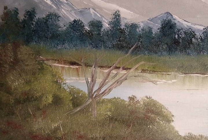 That said, I do like bits and pieces of the painting. There’s this bit, for instance, a group of trees along the riverbank. Please, ignore the gigantic mountain in the background.