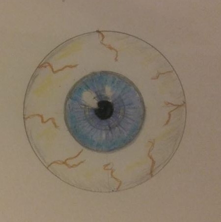 In my drawing, I colored in the sclera with a bit of cream and light yellow, then added gray for shading. I did use orange and red for the blood veins, but in the picture they look almost brown.