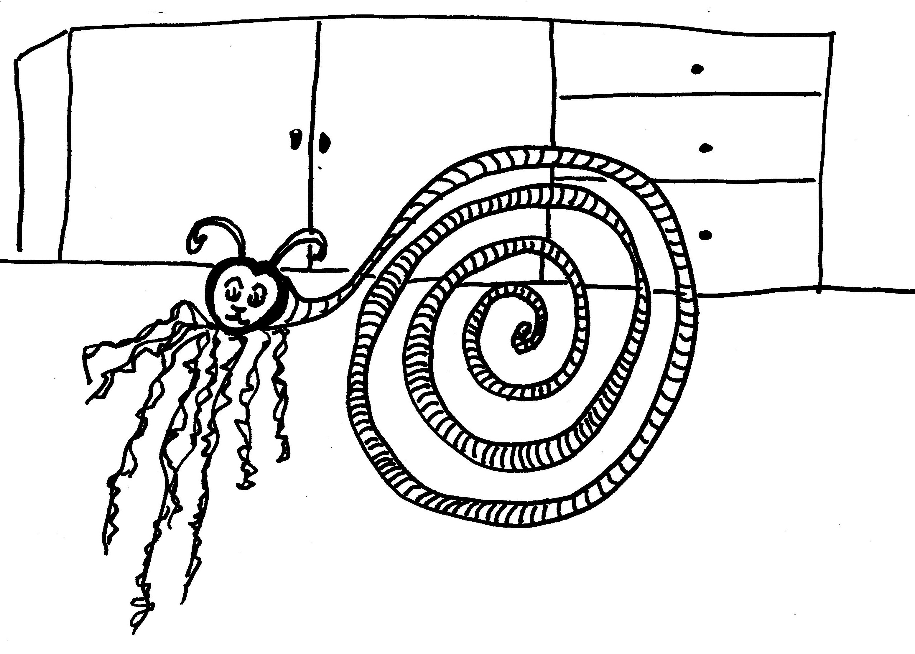With today’s prompt, however — drain — I knew immediately what I would draw. We’ve all seen drain snakes, not the urban legend sort, but the plumbing kind that root out all kinds of evils, especially hair.