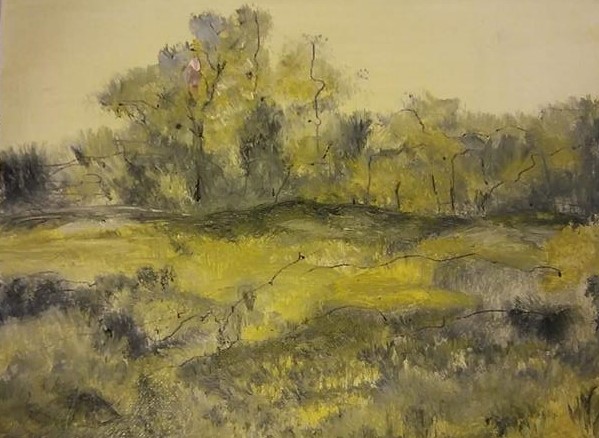 It is, obviously, another of the summer scenes I enjoy painting. I have a feeling I was learning about mixing greens and creating variations in the grassy area. But what are all those lines I’ve drawn on the painting? Did I draw those lines before I painted? Or afterward? Did I intend to use those lines as guides, going back and adding more lights and shadows? Some lines were apparently meant to be tree trunks. Others…? I have no idea. And is that — maybe — a fence at the left? Again, I have no idea.