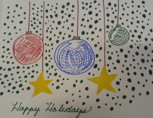 How intimidating for a still-beginning artist like me! I’ve been drawing for three years now, and I’ve learned lots of good pencil skills, so maybe I shouldn’t refer to myself as a beginner. Compared to other members (and, yes, I know, we should never compare ourselves and our art to others) I am definitely inexperienced, definitely a novice when it comes to creating art, especially what I call art on demand. To have a club leader hand me two pieces of cardstock with instructions to create two holiday cards for our dinner definitely brought out all my insecurities as a fledgling artist.