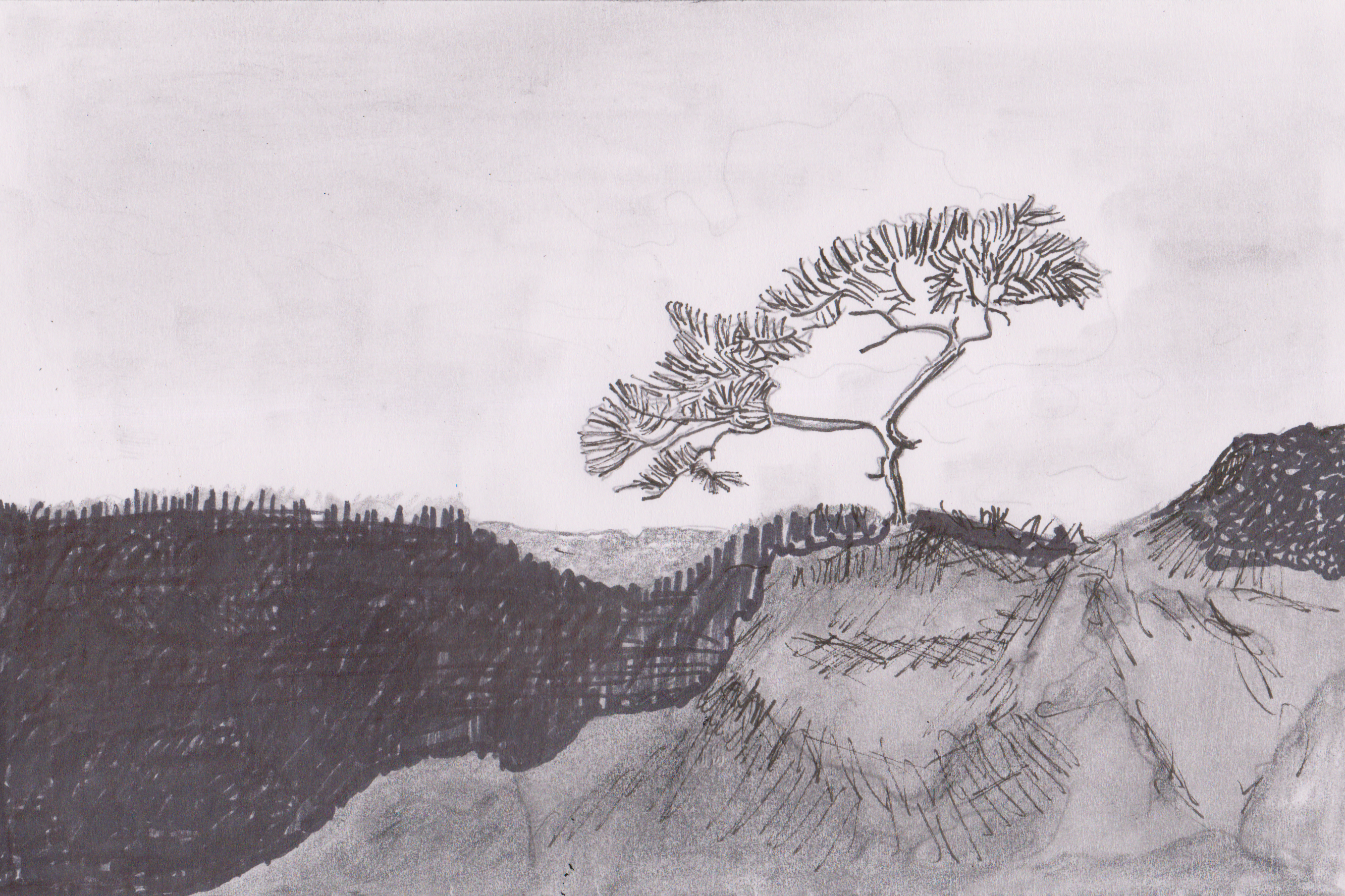 I’m very happy with the tree itself, and I like the very distant hills. I’m not happy with the inking over the dark forested hillside on the left, and trying to “ink-in” the rocky foreground was a big mistake, so I did only the topmost portion on the right side and used ink only for shaping the rocky edges a bit. I do like the sky. I’ve learned to use a blending stomp to create various shades in the sky so that it’s not stark white.