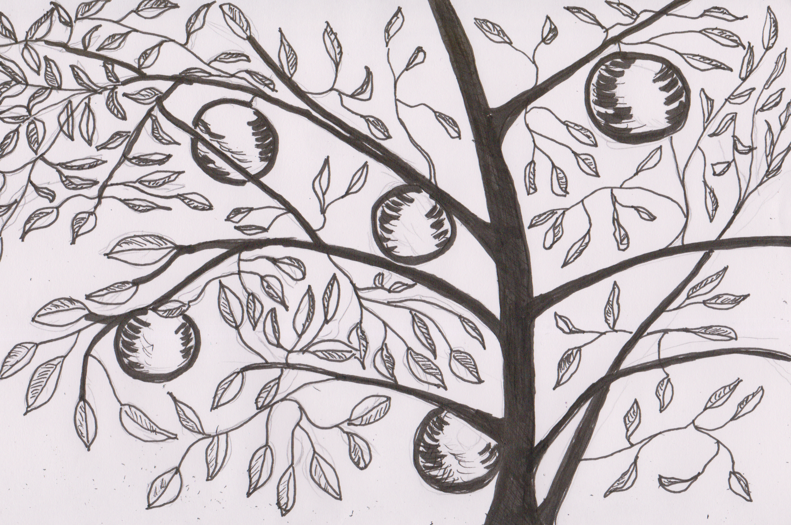 I inked the drawing — and completed all the leaves — with an “F” pen from my Pitt Artist set, but I felt it needed something more. I wanted more contrast. So, I took out that “B” pen from the set, and used it for the main branches of the tree. As a final decision, I also re-inked the oranges with the “B” pen.