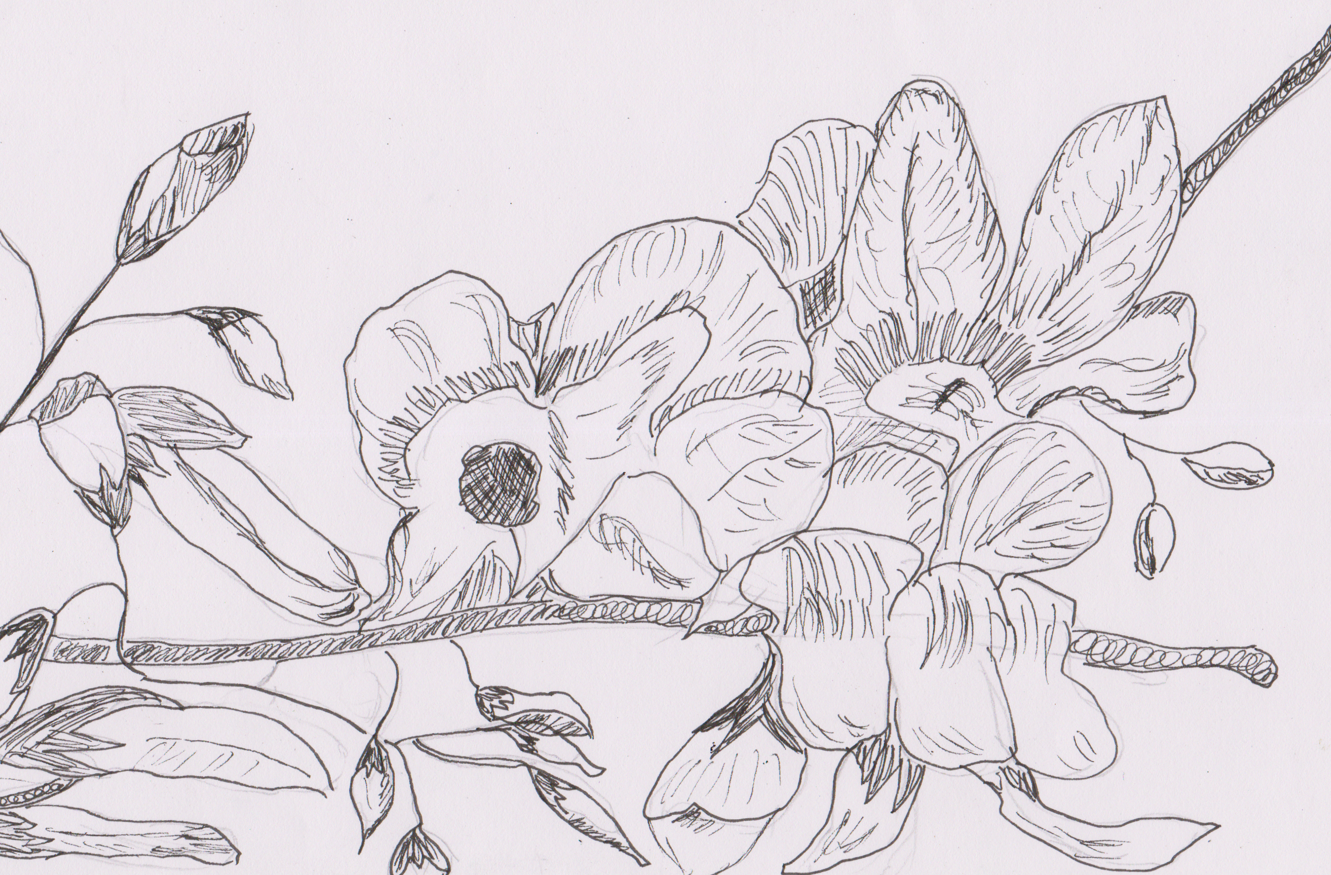 When I browsed for reference photos, I came across one that showed the lovely blossoms. I chose that photo not only because it was beautiful, but because it offered an opportunity for me to work with shading — a definite weakness in my ink drawings. In choosing this blossom photo, I didn’t think the flowers would be too difficult to draw.