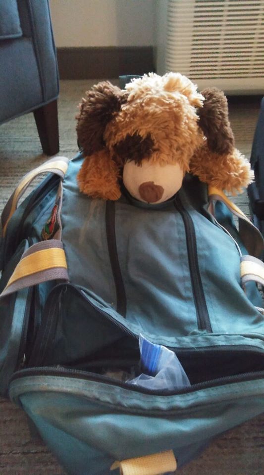 The adventure began when we reached our first stop — a lovely hotel in Jackson, Tennessee. It was then that my husband unpacked one of his bags, and like a weasel in a jack-in-the-box guess who popped out!