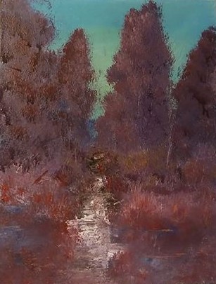 This one started off very promising. Originally the foliage on the trees was a rich red-violet hue with deeper shades of blue violet interspersed. But problems came when I tried to add highlights. Yes, too much medium — which with these paints means water. I ended up with a mess of mud, and despite efforts to correct the problem, I never could get back to the gorgeous colors I’d had at the start.