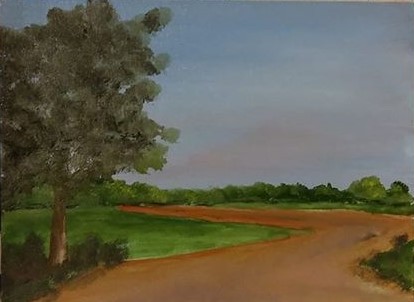I painted the sky, painted a distant tree line, painted a grassy field. I painted in the road, then just because I could, I added a tree.