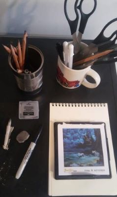 To make my art life easier, I took an empty vegetable can and washed the label off. I have intentions of painting it — someday — maybe — but why? It works just fine and looks just fine as a pencil holder exactly as it is. One of my favorite old mugs now holds three pairs of scissors, a Sharpie, two white gel pens, and a black ink pen I like. I’m keeping a blending stump, a kneaded eraser, and a second eraser right out on my desktop, and the Bob Ross calendar I got for Christmas is sitting there now to remind me what day it is. I also keep one small pad of drawing paper there.