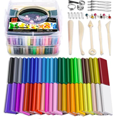 Not knowing what polymer clay crafting truly involved, I browsed Amazon for something akin to a “starter kit” — a fairly inexpensive introduction to what might or might not prove to be an enjoyable and rewarding hobby. That’s how I found this 46-color clay set, complete with tools, a few jewelry parts, and a handy little carrying case for it all!