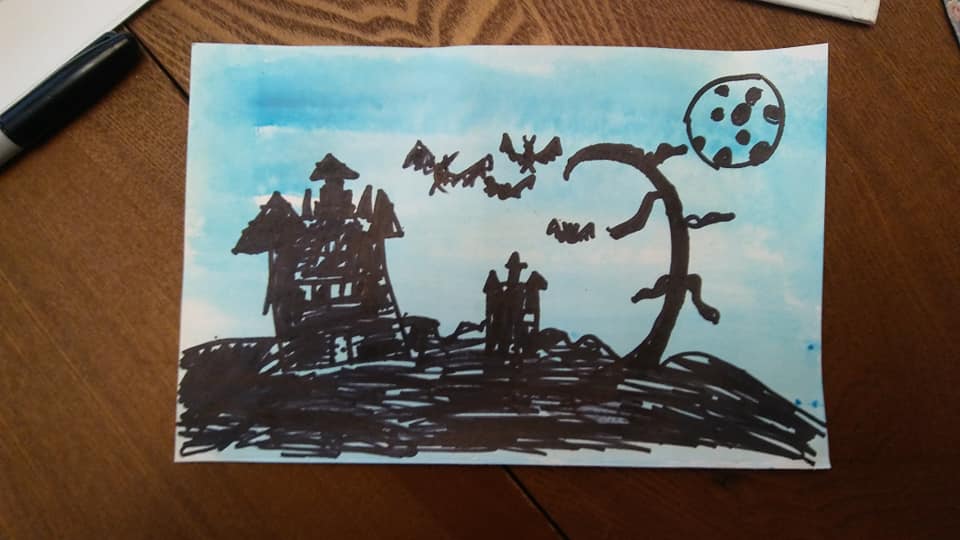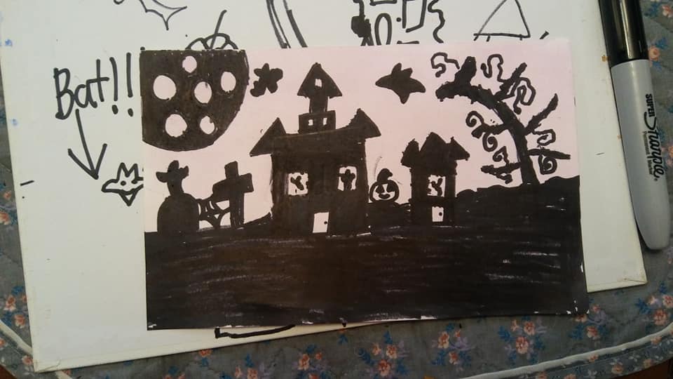 We all began with the same concept — two houses and a spooky tree. We each added a moon, Madox decided to put craters on his moon, and Carsen followed suit but colored his in differently. Carsen began adding bats, showed Madox how to make them, and Madox went on to add graves, ghosts in the windows of his haunted house, spider webs, and a pumpkin.
