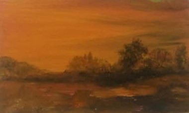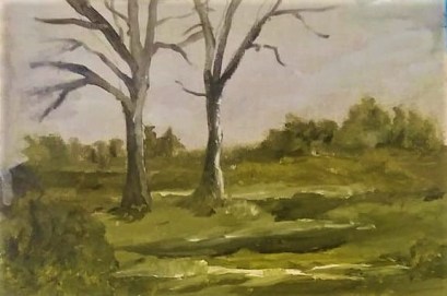 My painting, I suppose, makes no sense really. It’s definitely not autumn in this painting, and it’s obviously not winter. Most of the landscape appears lush and green — quite summery — but then there are the stark, bare trees. Dead trees, I guess. Standing in the middle of a summer meadow.