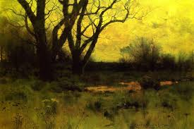 By this point, I had learned a bit about working with that hot “bubble gum” pink undertone, so I knew how to create the shimmering orange skies. I was working again with a painting from Charles Warren Eaton as my inspiration. For the record, here is his painting: