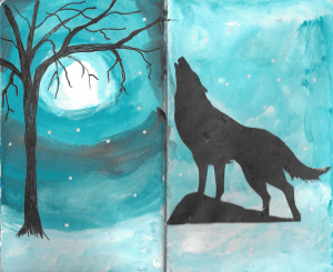 Here’s my version of “Winter Trees” along with a facing page I made by cutting out a wolf silhouette and pasting it down. Later I might look for an appropriate quote about winter, wolves, or howling at the moon.