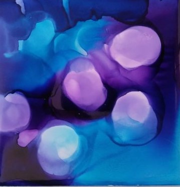 Nice, huh? Well, I think so. This was my first “practice” tile, using two of my favorite colors, blue and violet. I added white as a final step. First I applied a bit of blending solution, then did a “puddle drop” for the colors. I then moved the colors around a bit, but they dried a bit faster than I’d expected.