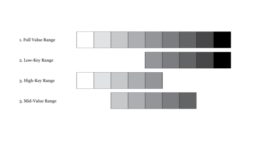 What I’m learning now is that it’s better — meaning wiser, easier, and more aesthetically pleasing — to select a range of values. This diagram shows the full range, then breaks it down into low-key, high-key, and a mid-value range.