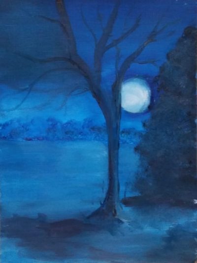 As I took out my canvas paper and prepared to paint, I considered a few other factors. My painting — like the reference photo — would be monochromatic, all based on shades and tints of blue. What about key? Definitely low-key using the darker values of the scale. What about that bright moon? No, it’s not pure white, but I have learned that when painting low-key, artists occasionally use small strokes of a very high-key color to provide interest and contrast. Since the moon is clearly the focal point here, I wanted strong contrast, so I did add a touch of lightness to the moon.