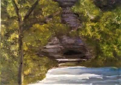 In some respects, this probably wasn’t the best possible reference photo because the various “masses” are not distinct shapes of light and dark. The foliage, as you can tell, has lots of light and lots of dark. I decided to go for it anyway. I liked the dark center — presumably a sort of cave going into the rocks — and I liked the play of the light on the water. I think, too, I was still a bit “under the influence” of Henri Matisse, still thinking of his idea thatΒ we should leave room for mystery.Β I can’t help but wonder what hidden things we might find in that little cave among the rocks.