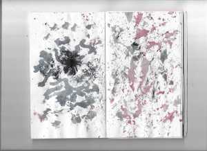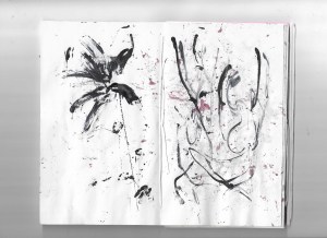 The right side of the page shows my scribbles with a single leaf. It was a bit flimsy, so I just let it move about the page, making its own sort of marks. Again, these drawings were done with blue-black gansai, with the other colors added later.