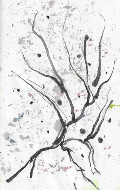 First, I used the twig. A twig that’s been dipped in ink or paint isn’t a lot different from working with a pencil. Well, all right, yes, it is different, but it’s the same idea. With enough paint on the twig, it can make lines very similar to those of a graphite pencil.