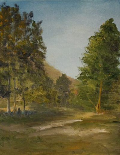 As for what more I’ll do with this unfinished work… I want to refine the brush strokes on the trees, maybe add a few branches. I want to highlight the lights on the tree trunks and add a bit of interest to the immediate foreground. I want to add more light and add more shadow. I’m open to suggestions, of course. What do you think the painting needs?