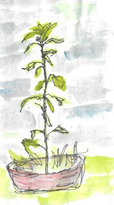This wild sunflower has been growing and growing, and it’s just about ready to open up. I was sitting on the porch a short distance from it last weekend, and I decided to sketch it in my simple, nature-journaling fashion.