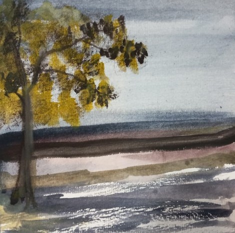In this quick painting, I used the dry brush technique for the foreground, and used the color with a bit more water on the horizon. For the sky I tried doing a traditional watercolor wash. That wasn’t too successful. Because of the ink in the mix, I ended up with a lot of granulation. I used a tissue to wipe it off a bit.