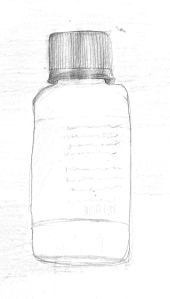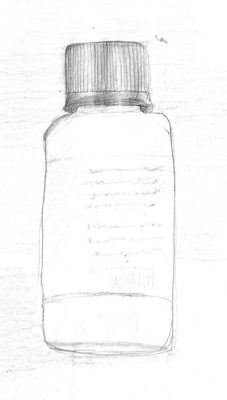 You can probably tell that I spent most of my twenty minutes drawing the cap and then quickly filled in the basic shape, the label, and a suggestion of words. I also used the side of the pencil to add a light background, and I put in a bit of shadow — neither of which shows up very well in the scan I did.