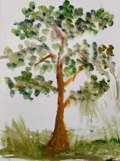 It’s not a work of art, but it was fun to do. Here, in this photo, it’s still wet and shiny in a few places, and yes, I just let the paint drip here and there when I stood it up. One side of the tree trunk is fuzzy and one side isn’t, because that’s one of the things I was learning — how to create fuzz and/or how to avoid it.