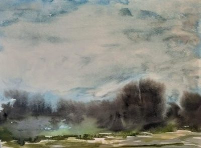 That’s how this little painting — 9 x 12 — came about. Cheap watercolor paper, one brush, a bit of tissue, and a few colors of gansai.