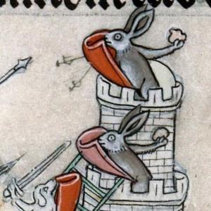 “Apart from aggressive rabbits, drolleries also depict a variety of other animals . This type of drollerie had its origins in bestiaries, which are compendia of beasts that were hugely popular during the Middle Ages. Bestiaries are thought to have lost their appeal by the second half of the thirteenth century, as evident in their decreased production.