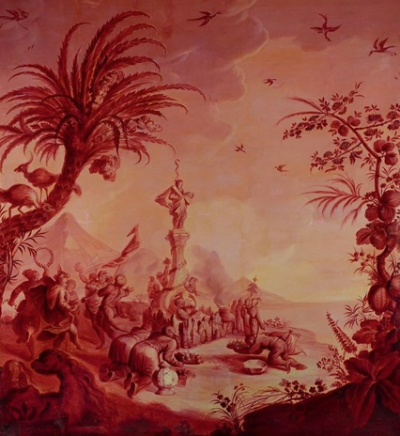 Surprisingly — or maybe not so surprisingly — I had to do a bit of searching to come up with examples of camaieu paintings. Here is one I found, attributed to Francois van de Buch (1756-1803), and titled “Grande Chinoiserie en Camaieu Rose”.