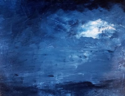 I loved the bright white “moonlight in the clouds” focal point, so I didn’t touch that part of the painting again. But I did “manipulate” the oil paint in other places. Although I never created the sort of “nocturnal scene” I envisioned, I came away with something imaginative, something intuitive, something that suggests a lot of different things. At least, that’s how it seems to me. Is this a lake? Are those reflections and ripples in water? Am I emerging from a dark cave, moving toward the light? Are those bushes and trees I see? Or is it just blue paint smeared on a canvas sheet?