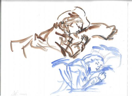 My assignment was to pick up a brush and trace over the lines Rembrandt made. I used a sienna for one drawing, then changed to blue for another. Instead of ink, I choose to work with my Cotman watercolors.