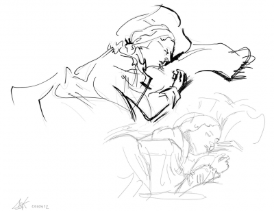 I enjoyed this exercise. I felt as though I were there, watching Saskia sleep. The loose, flowing lines have a gentle, relaxing feeling, and as always, it was interesting to see how even a very small line can become very expressive. Look closely at the eyes. They’re only fine lines.