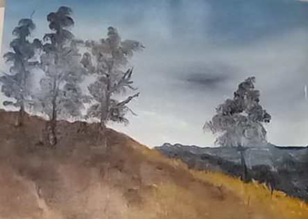 With the poor photo that I’ve enlarged here, the detail of the brush strokes is lost. I carefully used a thick bristle brush to provide texture for the grassy hill. It was looking fairly good, to tell the truth. But then… oopsie! This one was my fault. I realized I should have painted the midground “distance” area first. I managed to add that area to the painting, tweaked the foreground a bit, and reminded myself that this was only a “quick study”.