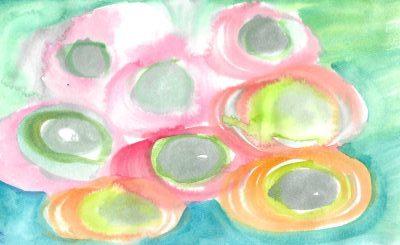 I first used a large flat brush to wet the paper, and then I used it to draw eight very loose circles, each with a different color ranging from deep red to a yellow orange. Next I used a small angled brush to go over the circles again with slightly different colors. Finally, with the angled brush, I “filled in” the centers and used a blue-green to create a background.