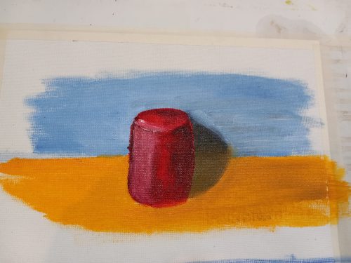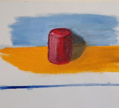 But then along comes a morning like this one. I settled into the studio eager to get started on today’s project — painting a simple cylinder in primary colors. In some ways, this painting project was similar to one I completed two years ago — to the day, in fact.