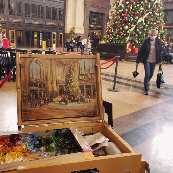 I’m feeling a little discouraged this morning. It didn’t help at all that after my less-than-stellar results at the easel today, I followed a Facebook notification to one of our local art groups and saw this gorgeous painting of the Christmas tree at Union Station: