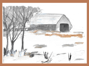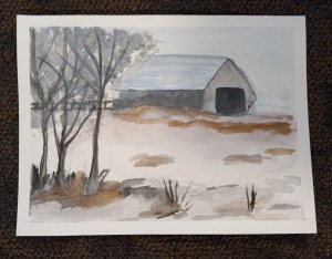 I’m not proud of this painting, but I am happy that I managed to draw and paint a building, and I even added a fence, although I’m wishing now I’d extended that fence past the barn on the right. That would have created a bit more balance, I think. Of course, most of my fence was all but obliterated by the trees. Oh, well. For me, it’s still a step in the right direction. I did create a snowy scene, and I feel this little watercolor has helped me gain a better understanding of various techniques and a greater awareness of the style I’m developing.