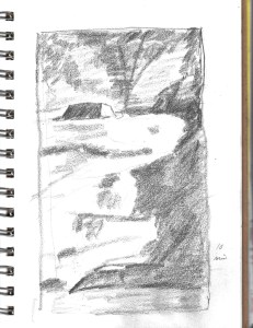 Even here, it’s difficult to see, I know, but these three small value sketches represent the three different views I was considering. After looking at the photos and my quick sketches, I choose the second view. I felt that this had a lot of interest with the dark values at the right and the strong diagonal lines formed by the waterfall.