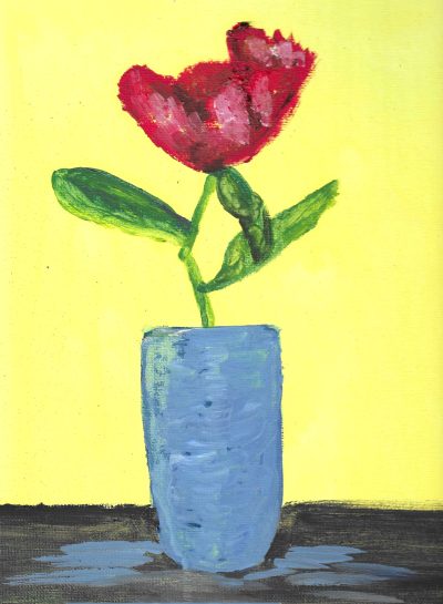 And what about oil? This was one of my least favorites, but it was definitely good practice. It reminded me a lot of that “slapdash flower” lesson from Arnold Fletcher’s oil painting how-to book. This tulip was definitely a bit “slapdash”, and yes, maybe I was getting a little weary of painting the same blue vase and the same tulip over and over. I was still having fun, though, and I playfully let my blue paint “spill out” around the bottom of the vase. I liked it.