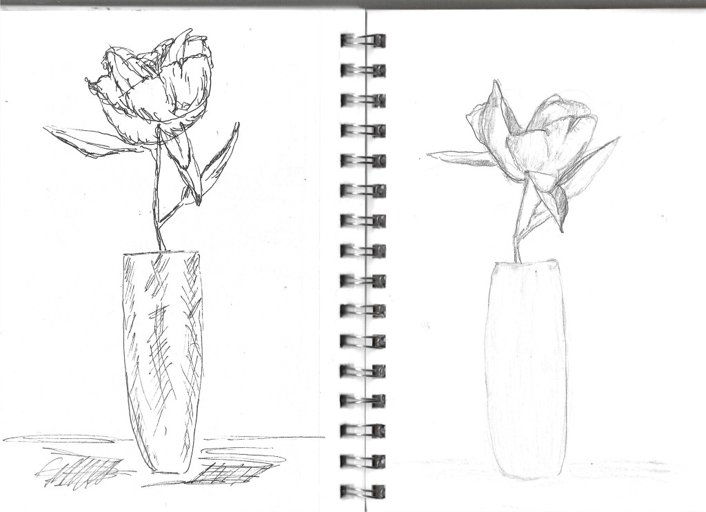 The pages from my sketchbook (below) show both my first quick graphite sketch (on the right) and the subsequent ink drawing I made (on the left). By the way, in the pencil drawing, there is a bit of light shading on the vase but it didn’t scan well.