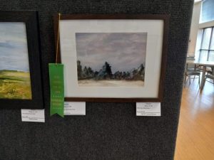 Kayla and I enjoyed browsing all the exhibits, and gradually we wended our way toward the Opaque category and on to my painting. Oh, my goodness. There was a ribbon hanging on “New-Fallen Snow”. Kayla was excited. I was dumbfounded. My painting had won an Honorable Mention award.