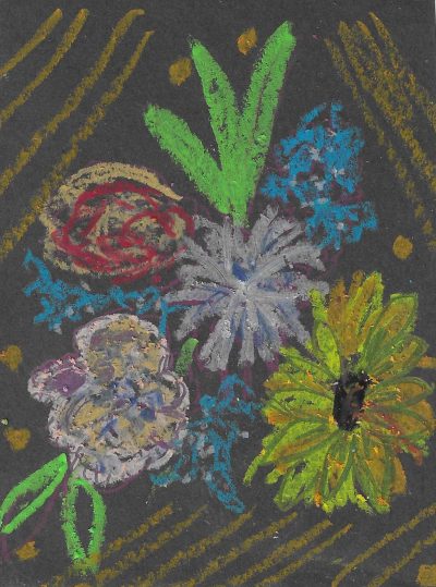 And one more, this one done in oil pastels on black construction paper, with a few added “doodle marks” in the background.