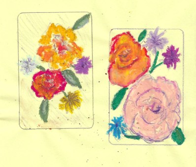 That little tip was the inspiration for these two floral studies. The assignment was to use a toned background, so these were done on a yellow-beige paper. The initial drawings were made with colored pencils, and oil pastels were then used to provide color details.