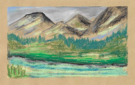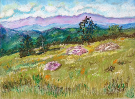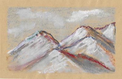 I started this painting using my Expressionist oil pastels. They were close at hand. I knew I needed to do a bit of “line drawing” to shape the mountains. Fine. But then, when it came time to add definition to the mountain, to suggest all those lights and shadows, I had no choice but to reach for my smooth Senneliers. Oh, how they glide across the paper! How easy it was to blend colors on those mountain peaks. And how costly it is to use them! Yes… every time I pick up a Sennelier oil pastel, dollar signs flash through my mind. They are very precious — in so many ways. I don’t want to waste them on quick studies or daily practice drawings. I want to save those gorgeous Senneliers for those times when nothing else will do.