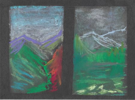 After completing this landscape, I attempted a couple others, failed miserably, and decided that maybe oil pastels and I just weren’t meant to be. I set them aside and until recently I’d never gone back to them.
